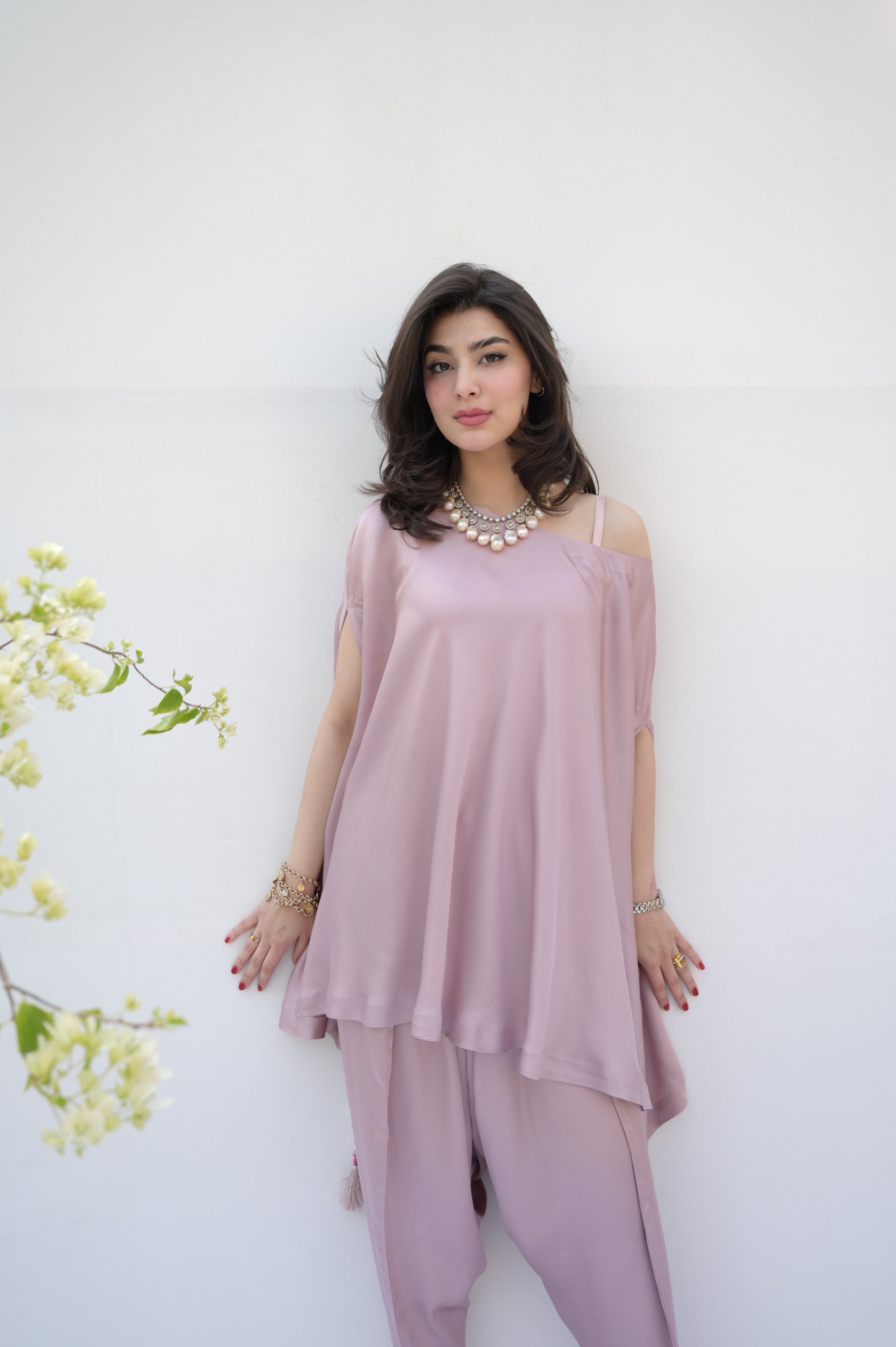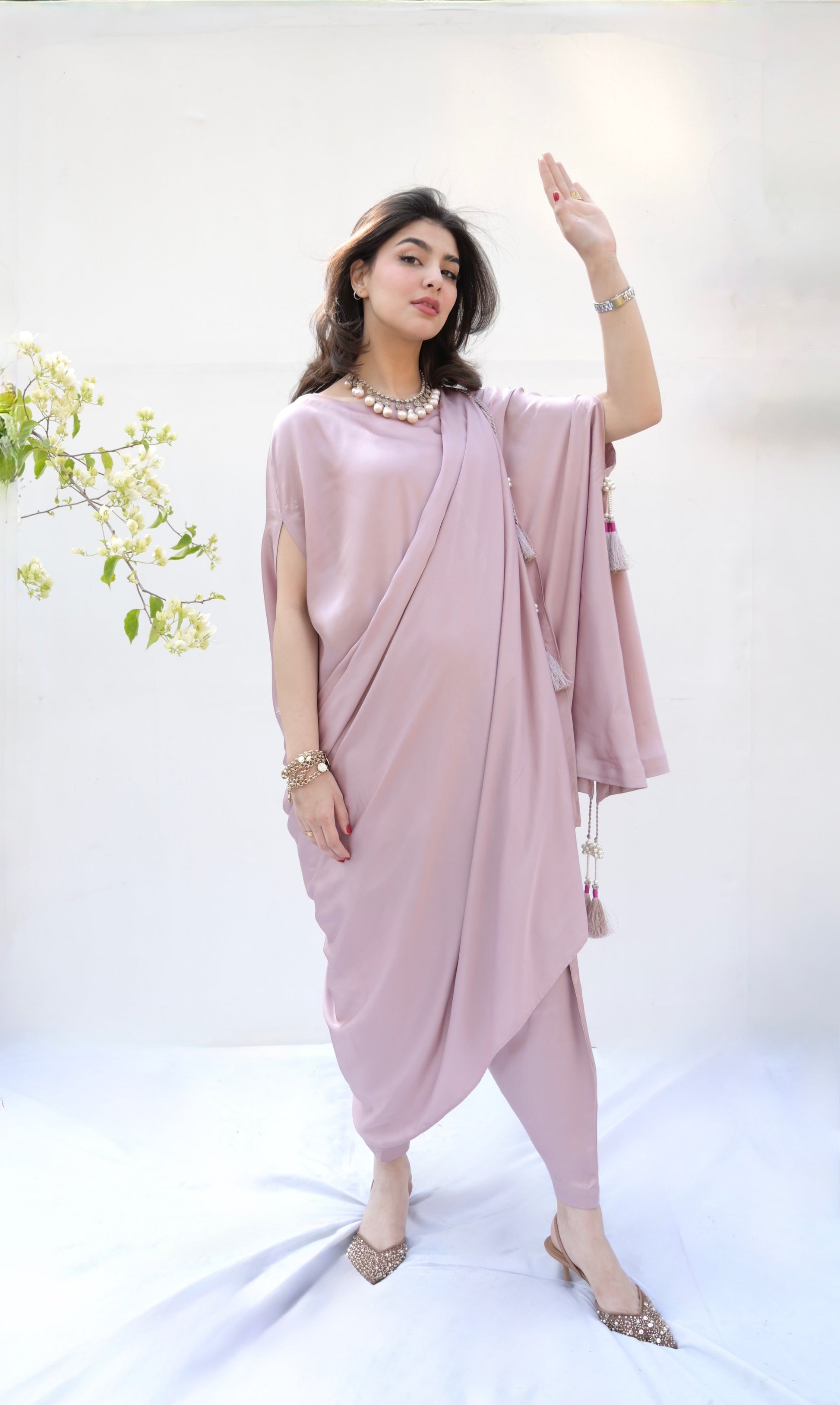 The Dusty Pink Drape set features a satin flowy shirt with a subtle sheen, satin harem shalwar and a stitched draped dupatta.